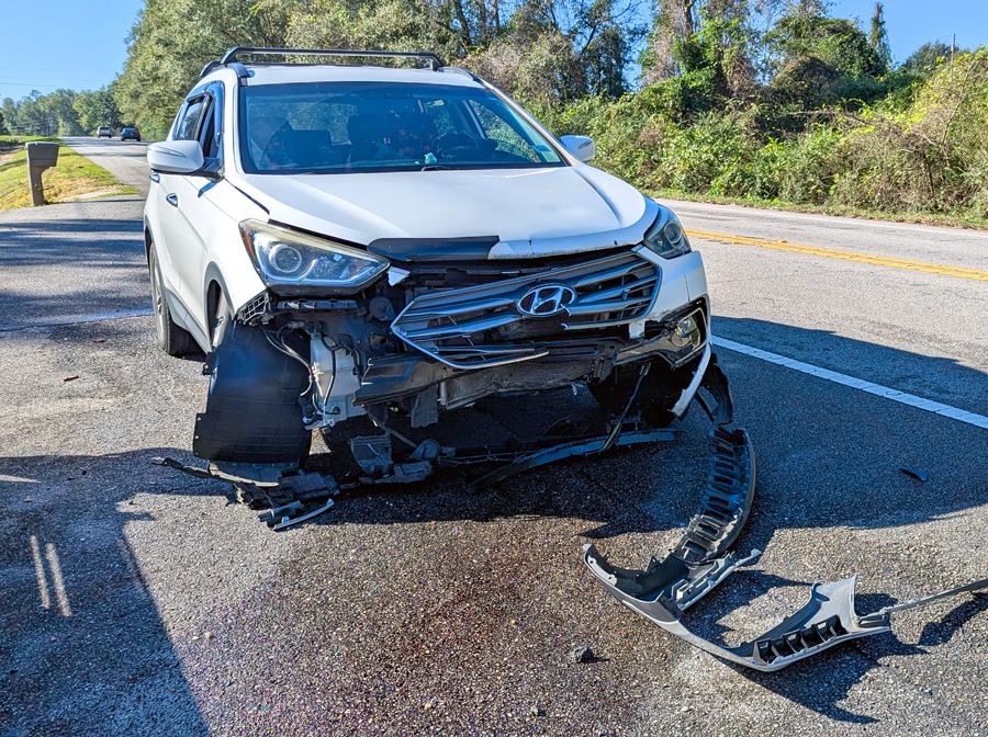 The adult female driver of a Hyundai Santa Fe rear-ended a Ford pickup truck and utility trailer on Highway 97 north of the Walnut Hill Community Center. The northbound pickup driver was reportedly stopped for a school bus that was waiting to turn left onto Wiggins Lake Road. The pickup driver attempted to pull out of the way, but was rear-ended.