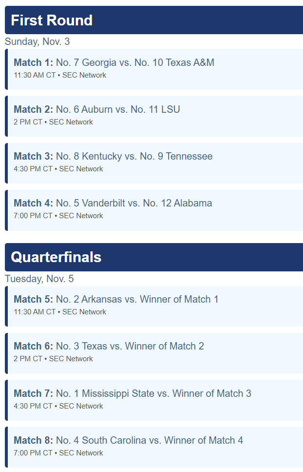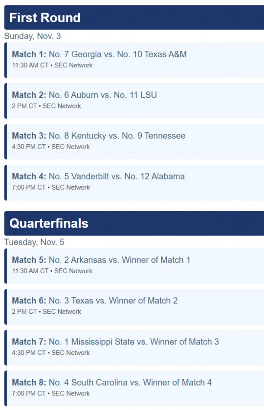 The schedule is below for the first round on Sunday and the quarterfinals on Tuesday. Winner advance to the semifinals on Thursday and the championship on Sunday, November 10.