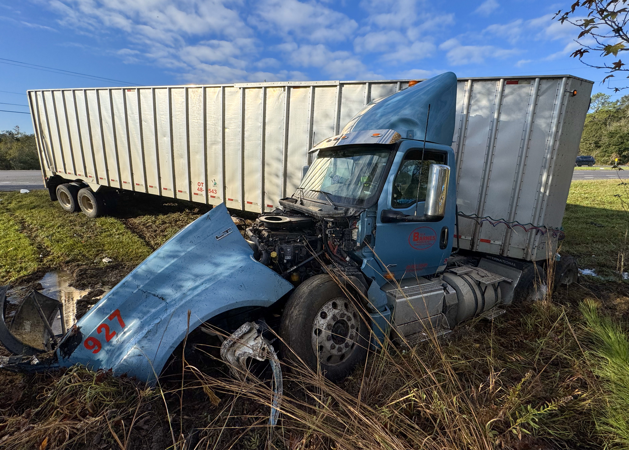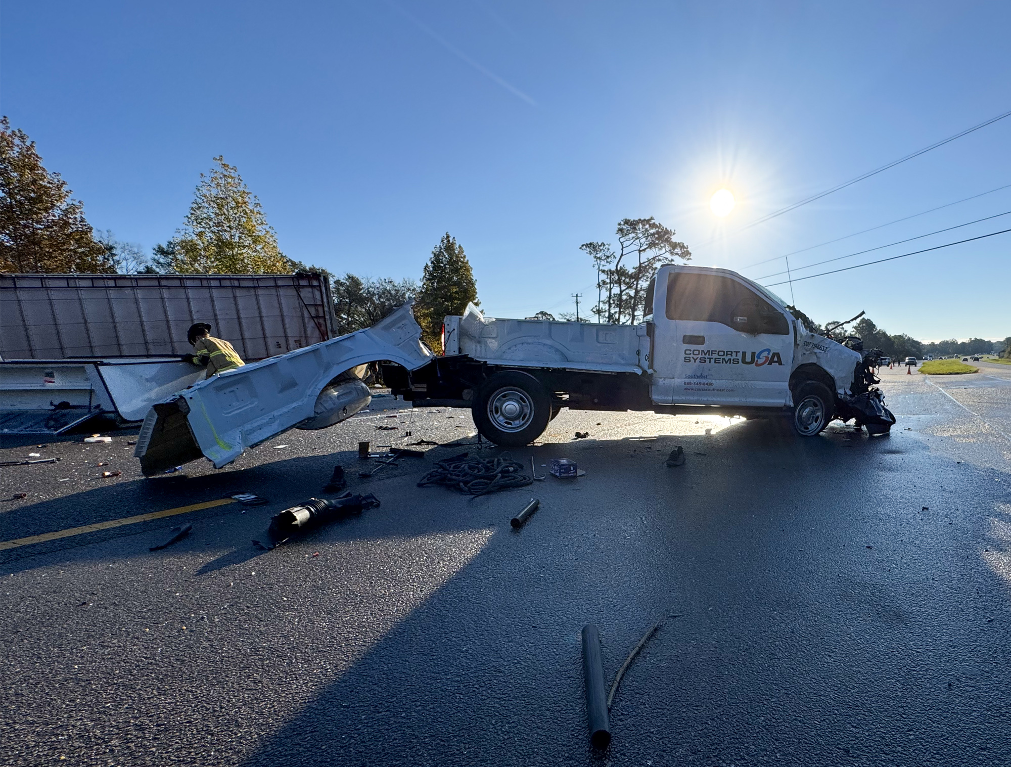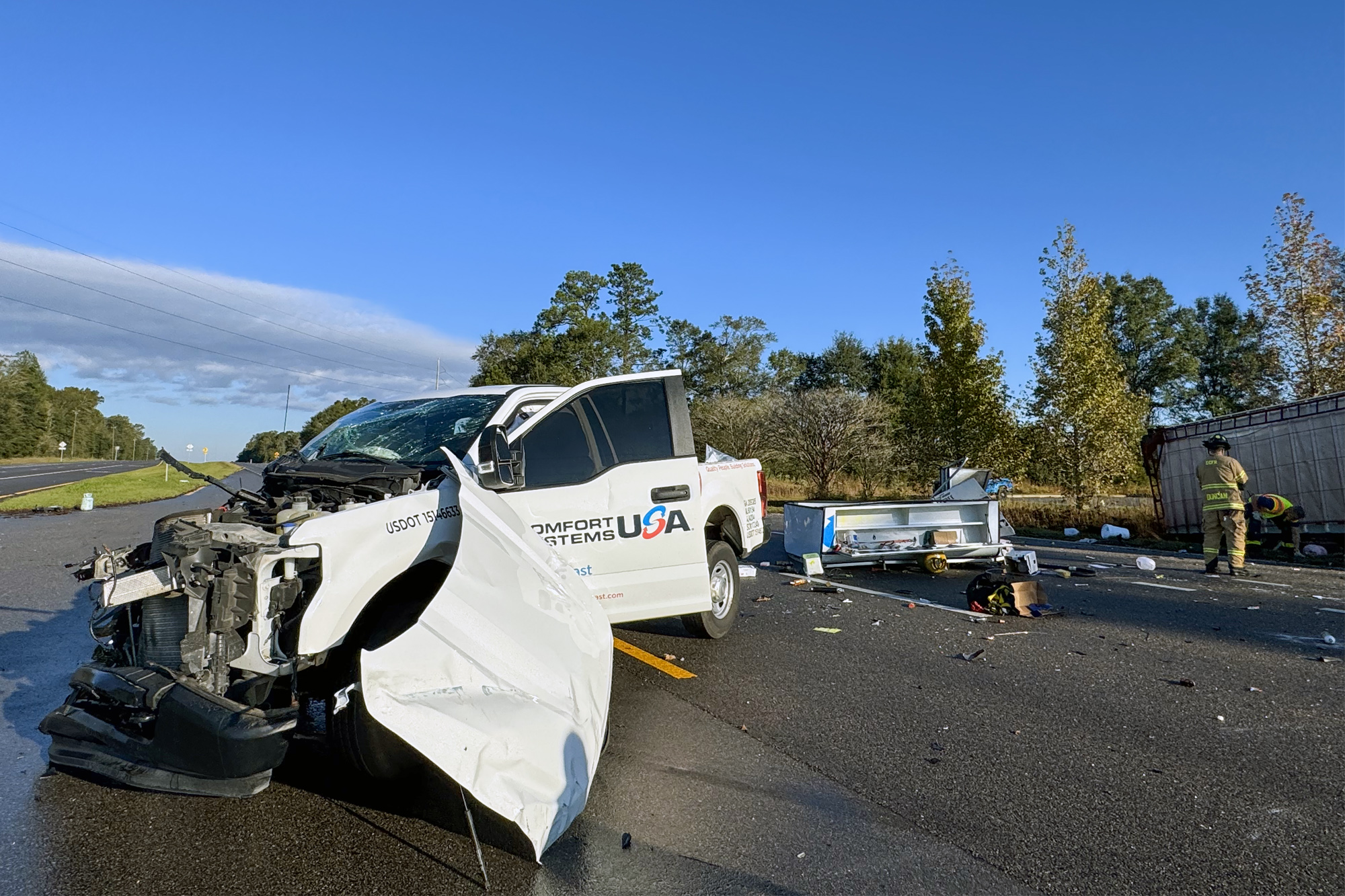 A crash involving a pickup truck and a semi closed Highway 29 in Cantonment for hours Thursday morning.
