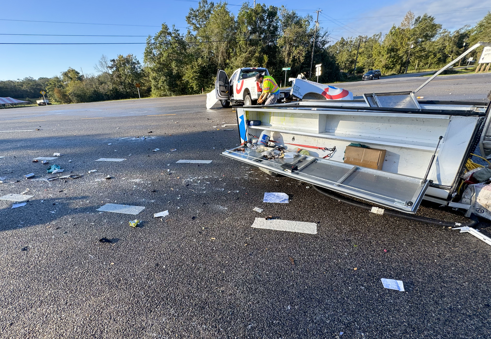 The roadway was closed for hours for cleanup, including the accident vehicles, a diesel fuel spill. and a large number of screws and other material on the road.