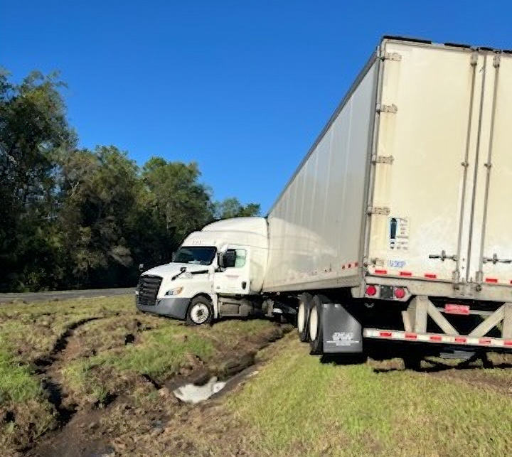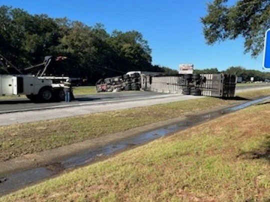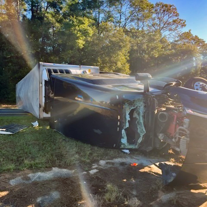 The Florida Highway Patrol said a semi overturned. The driver – a 46-year-old Sacramento man, told troopers that he stated that he thought he fell asleep and went off the roadway. The front tires entered the grassy median, which caused the truck hauling 37,000 pounds of cranberry juice to roll onto its passenger side. As the truck left the roadway, it collided with a four-door sedan driven by a 93-year-old Pensacola man. His sedan collided a car driven by a 47-year-old Milton woman. A semi drive by a 34-year-old Hattiesburg woman then jackknifed while attempting to avoid the collisions.