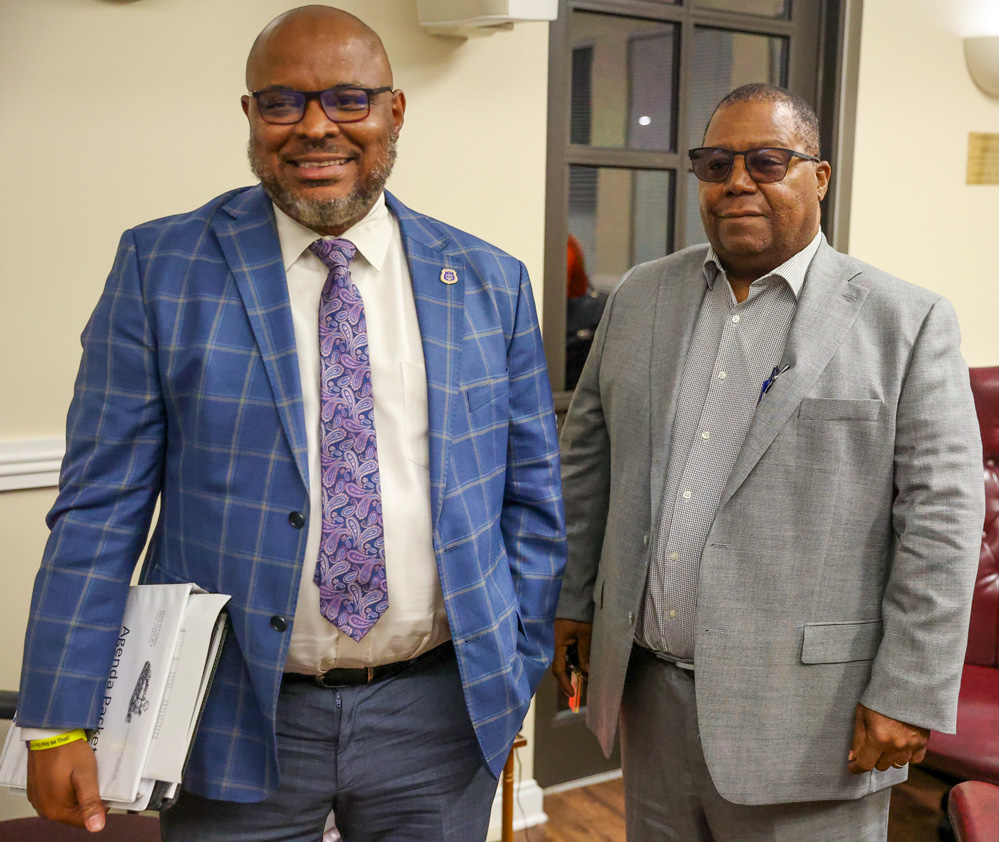Pictured top: Howard Brown (left) whose company Local Government Consulting Group acts as town manager for Century and Mayor Luis Gomez, Jr. following a town council meeting last month. NorthEscambia.com photo, click to enlarge.
