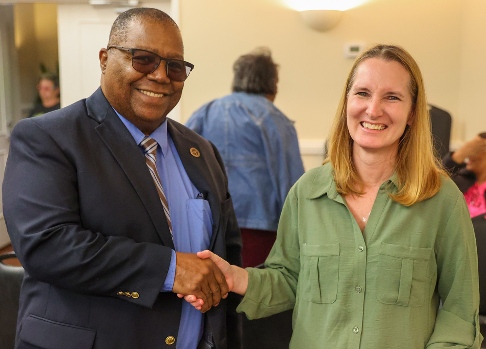 Pictured: Century Mayor Louis Gomez, Jr. congratulates Jennifer Tien of Michigan after the Century Town Council voted December 17 to hire her as town clerk. Pictured inset: Tien said quietly in the audience prior to the council’s vote. NorthEscambia.com photos, click to enlarge.