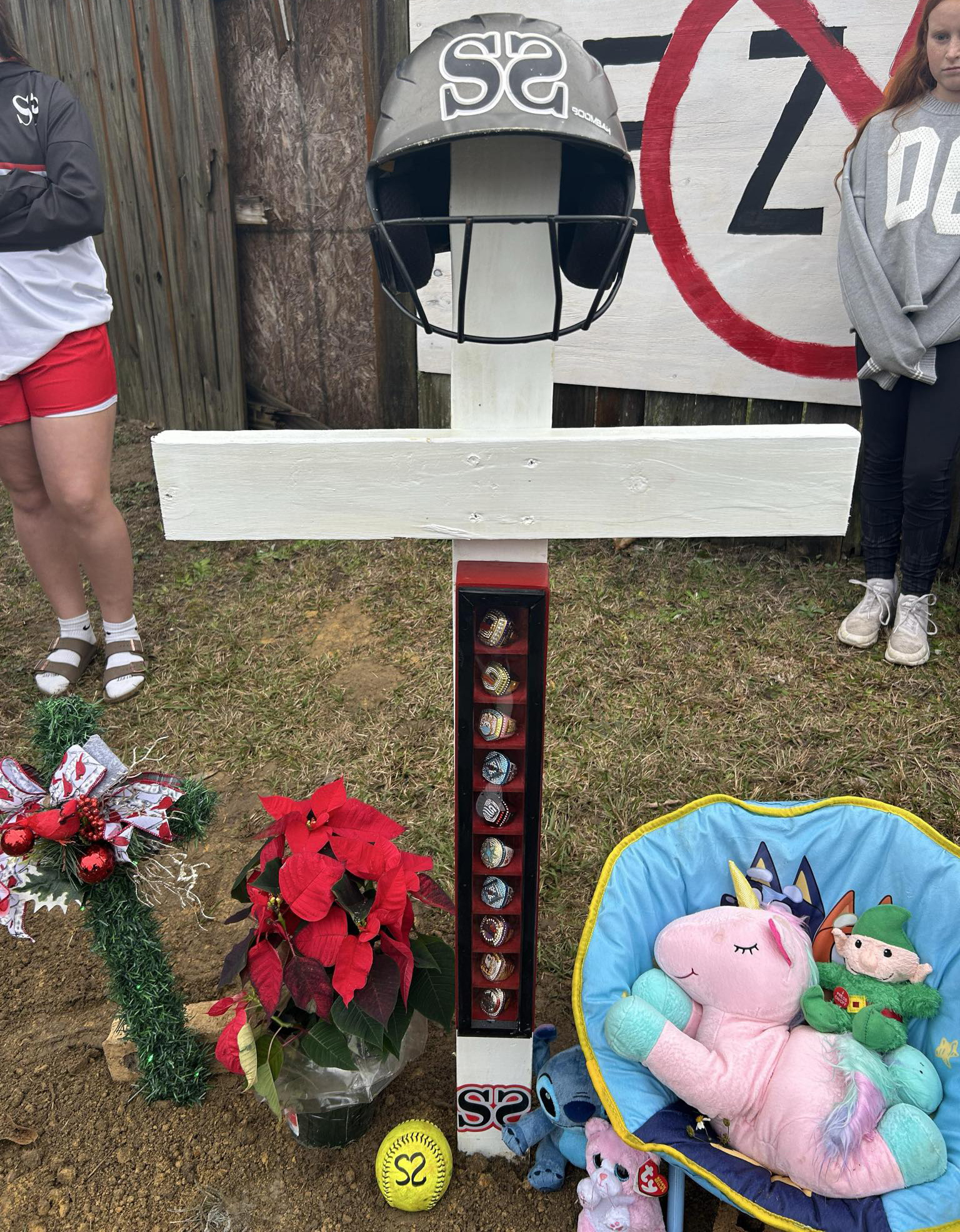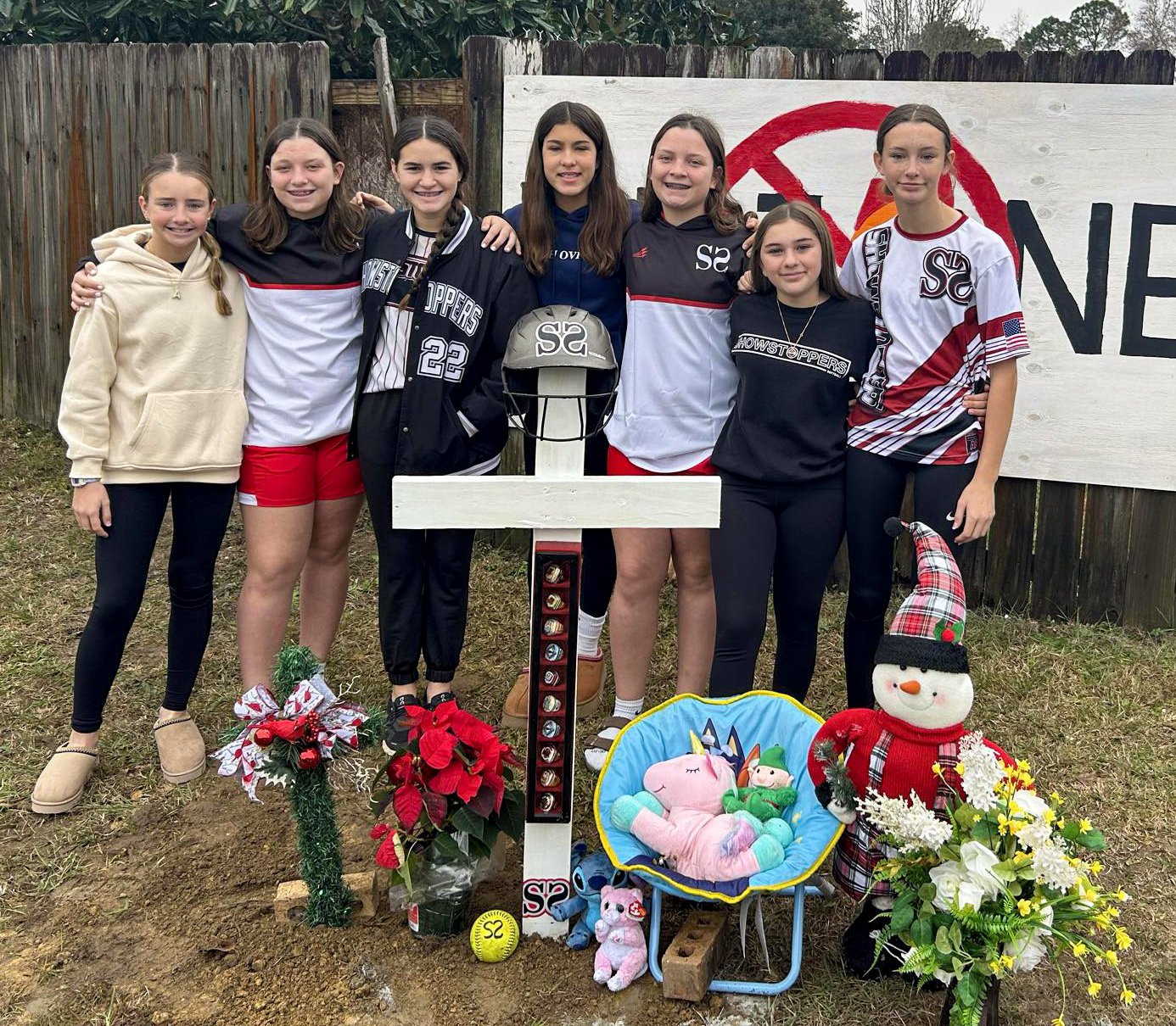 Show Stoppers players place the cross, topped by a helmet, Thursday. It’s surrounded by Christmas flowers and stuffed animals. While Sofia joined the team just over two years ago, about 10 of the players have played softball together for years.