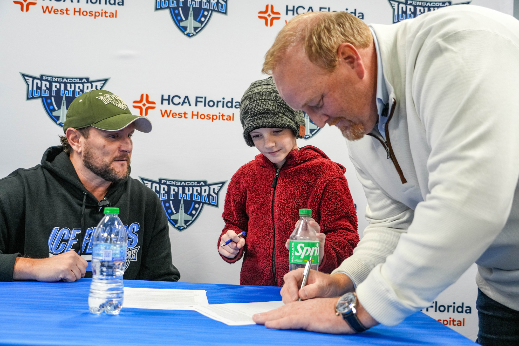 The day began with White meeting Team Owner Greg Harris and receiving a warm welcome from the staff, who captured the special moments with photos and video. White then visited the office of Head Coach Gary Graham, and then signed his official contract, becoming the youngest Ice Flyer in team history.