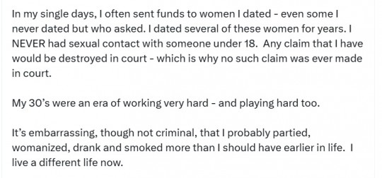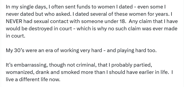 “In my single days, I often sent funds to women I dated – even some I never dated but who asked. I dated several of these women for years. I NEVER had sexual contact with someone under 18. Any claim that I have would be destroyed in court – which is why no such claim was ever made in court.”