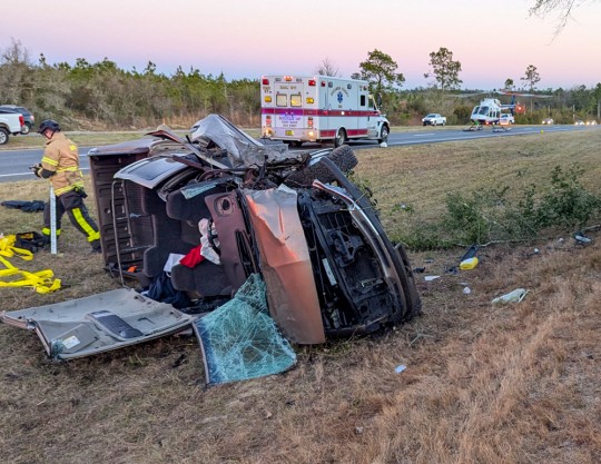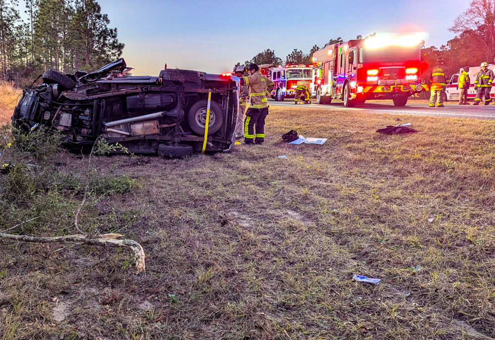 The Florida Highway patrol said the man was the driver of a Chevrolet S10 pickup truck that was traveling south. He ran off the roadway, crossed over the median and northbound lanes before running up a small embankment and colliding with a tree. The pickup overturned, coming to rest on its passenger side in a ditch. He was ejected from the vehicle and pronounced deceased at the scene.
