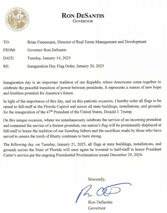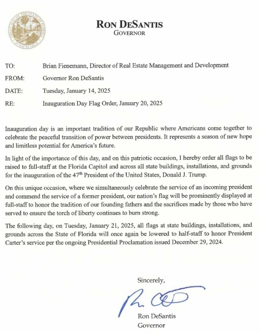 “On this unique occasion where we simultaneously celebrate the service of an incoming President and commend the service of a former President, our nation’s flag will be prominently displayed at full staff to honor the tradition of our founding fathers and the sacrifices made by those who have served to ensure the torch of liberty continues to burn strong,” reads the memo from Florida Gov. Ron DeSantis.