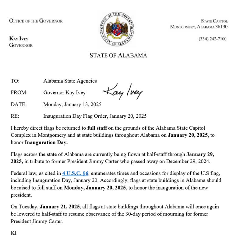 “Federal law, as cited in 4 U.S.C. §6, enumerates times and occasions for display of the U.S flag, including Inauguration Day, January 20,” Ivey reasoned in her memo. ” Accordingly, flags at state buildings in Alabama should be raised to full staff on Monday, January 20, 2025, to honor the inauguration of the new president.”