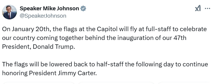 “On Jan. 20, the flags at the Capitol will fly at full staff to celebrate our country coming together behind the inauguration of our 47th President, Donald Trump. The flags will be lowered back to half-staff the following day to continue honoring President Jimmy Carter,” Johnson wrote on X.