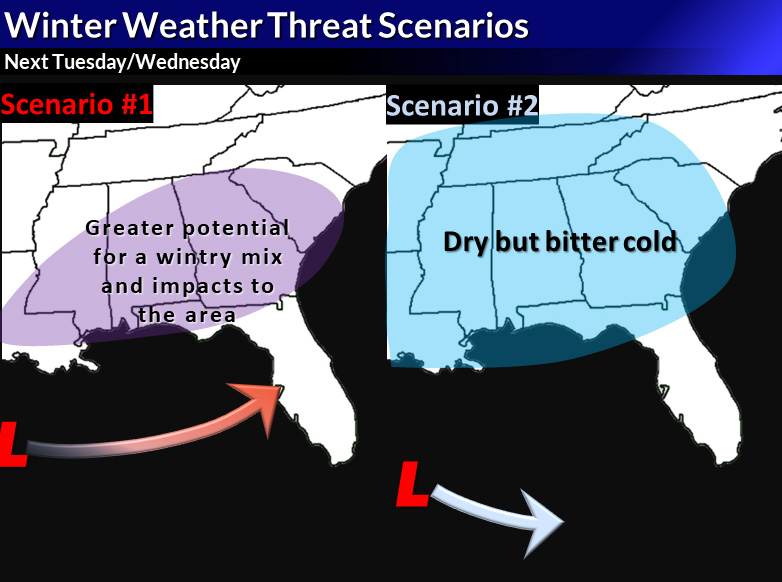 - The extent of the winter weather threat. There are two scenarios (pictured above) that we will be watching: