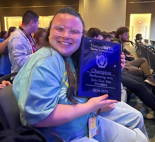 With an outstanding performance, Gabby Handy (pictured below) won first place in the Solo Vocals competition. She earned a “Golden Ticket” to the National Convention in June 2025. The Beta Club members enjoyed participating in the convention scavenger hunt and won third place.