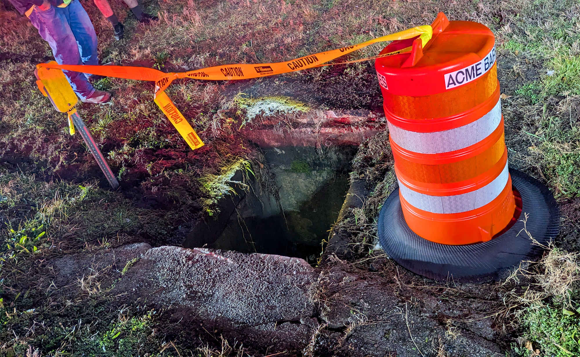 In the photo agove, the caution tape was added to a signpost and barrel that were placed to mark the storm drain following the crash.