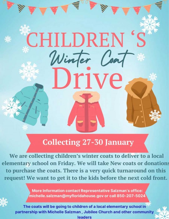 - Make a Monetary Donation: Contributions will help purchase new coats for children. Monetary donations can be coordinated through Salzman’s office at (850) 207-5024 or via email at michelle.salzman@myfloridahouse.gov.