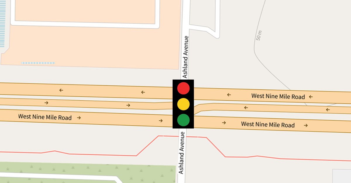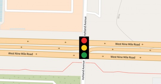 Drivers on Nine Mile Road will encounter a yellow flashing signal, meaning they should slow down and proceed through the intersection with caution. Drivers on Ashland Avenue will stop with a red flashing light.