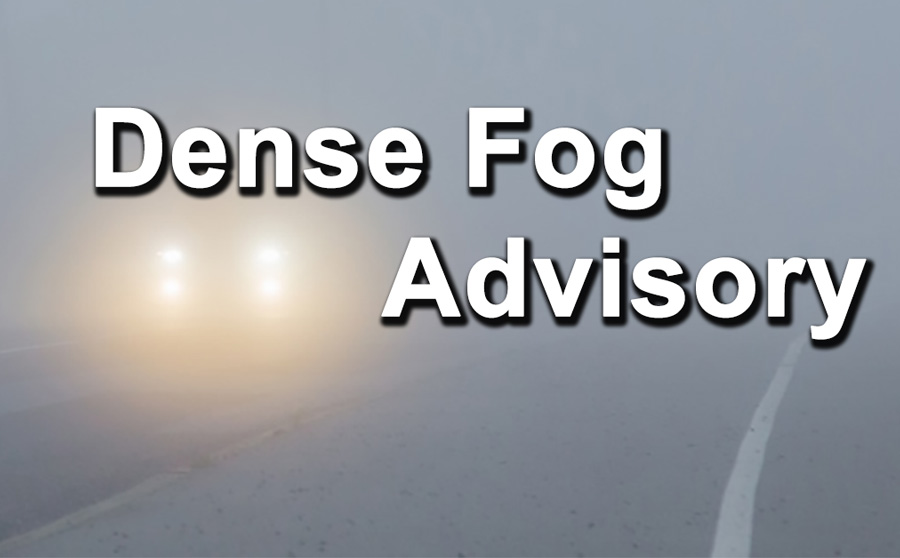 There is DENSE FOG ADVISORY IN EFFECT from midnight to 10 a.m. Tuesday with visibility one quarter mile or less in dense fog creating hazardous driving conditions.