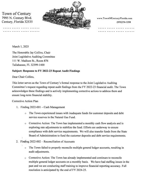 The Town of Century has filed a response to an inquiry form the Florida Legislature’s Joint Legislative Auditing Committee (JLAC) requesting answers regarding findings from its last three years of audits.