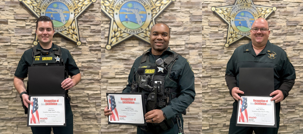 Mothers Against Drunk Driving (MADD) of Northwest Florida recently awarded Lt. Brian Shorette, Deputy Timyron Young, and Deputy Adam Norre for their exemplary service and dedication to transformative change in our community by making over 40 DUI arrests total in the year 2024. Photos for NorthEscambia.com, click to enlarge.