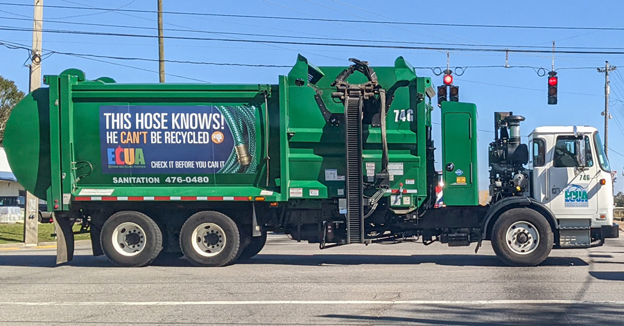 ECUA ordered replacements in 2022, expecting delivery in 2023, but global supply chain delays have pushed arrival to June 2025. In the meantime, when a smaller truck is out of service, ECUA may need to collect both garbage and recycling using a single vehicle in select areas.