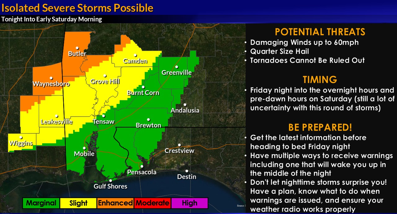 Saturday afternoon through Saturday night: The initial round of storms should come to an end by daybreak. In fact, we may actually have a brief dry period through the rest of the morning hours. Do not let this fool you though as scattered thunderstorms are expected to redevelop during the afternoon hours. The environment by this point will be supportive of a likely severe outbreak, consisting of strong to potentially violent long-track tornadoes, damaging to destructive winds, and large hail. This round will come in two waves: the scattered thunderstorms during the afternoon followed by a broken squall line during the evening hours. The North Escambia area is in a Moderate Risk [risk level 4/5]. Do not focus on where the high risk area is located. Our entire local area will be primed for significant severe weather so do not let your guard down . Be sure to have multiple ways to receive warnings. Storms should diminish from west to east during the overnight hours Saturday into early Sunday morning.