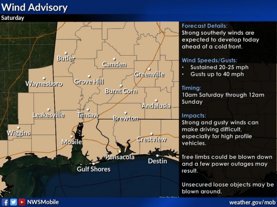 Non-thunderstorm winds: Outside of thunderstorms, it will be quite windy across the area. Over land, a Wind Advisory is now in effect from 10am Saturday through 12am Sunday across the entire local area. Sustained winds of around 20-25 mph, with gusts to around 40 mph can be expected. Similarly, a Gale Warning is in place for our the Gulf waters out 60nm from 10am through 7pm on Saturday. Frequent gusts to around 35-40 knots and seas building to 7-10 feet can be expected in the warned area. A Small Craft Advisory is in place for our local bays and sounds for wind gusts to around 30 knots.