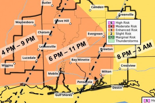 Damaging straight-line winds are the primary threat, and a few tornadoes EF2 or greater are possible. In the North Escambia area, the timing will be late evening, before midnight.
