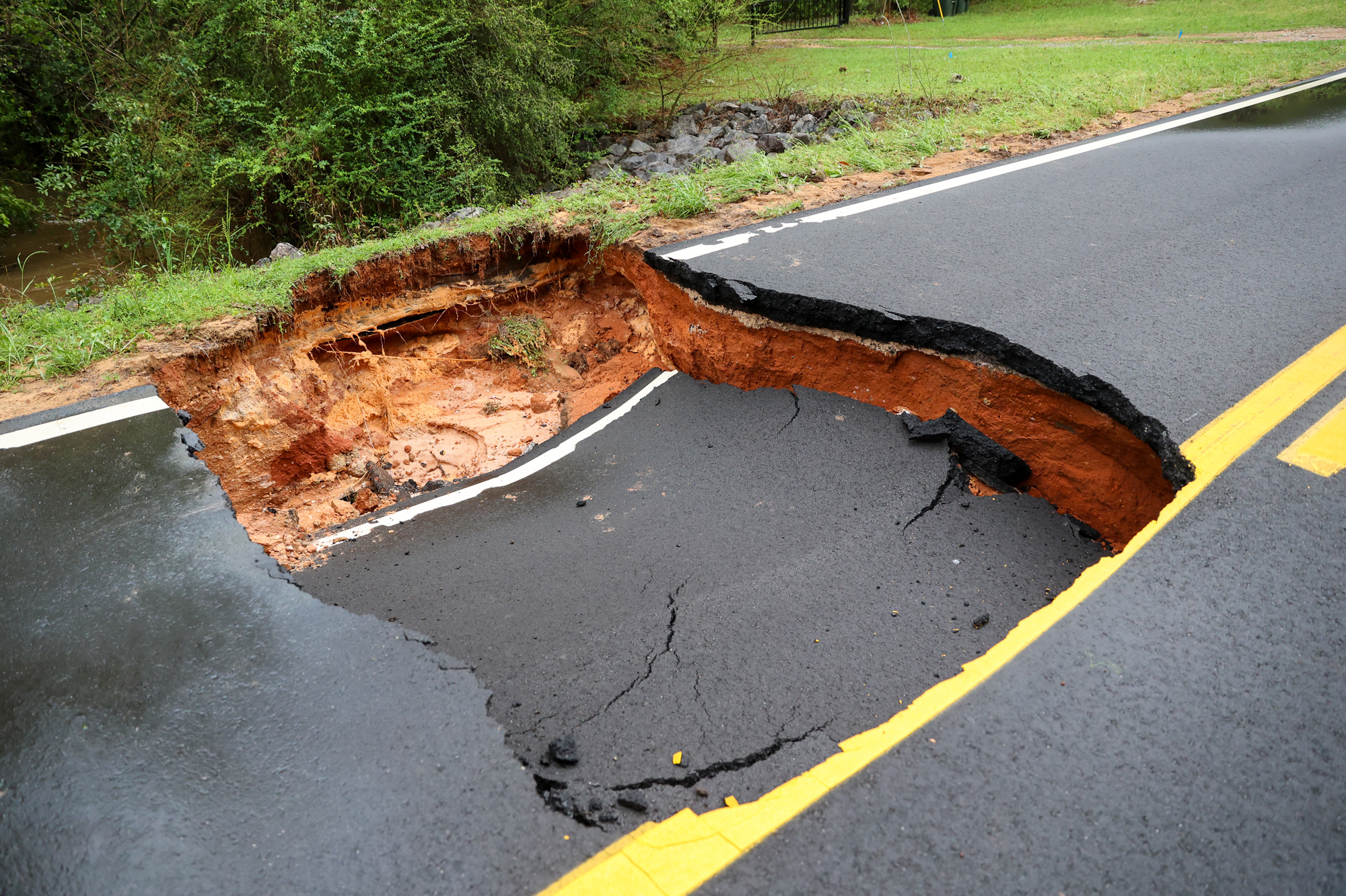 A portion of Pine Forest Road just north of Arthur Brown Road completely collapsed at a drainage culvert due to rushing water. Sometime before daybreak, the driver of Chevrolet pickup truck hit the sinkhole in the dark, heavily damaging the truck. The driver was not injured.