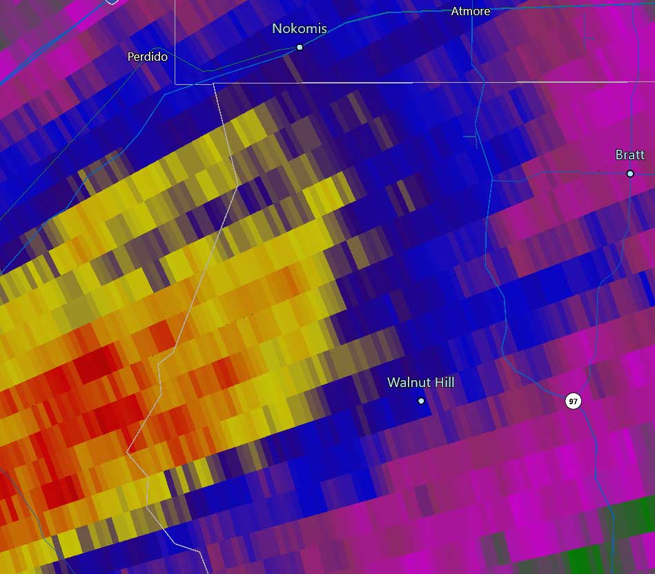 All of the roads are west and southwest of Walnut Hill, where radar estimates indicate over a foot a rain fell Sunday night into early Monday morning. The weather station at the Walnut Hill Fire Station recorded 8.15 inches of rain. (The yellow and red areas on the radar image below show an estimated 12 inches of rain or more in the past 24 hours.)