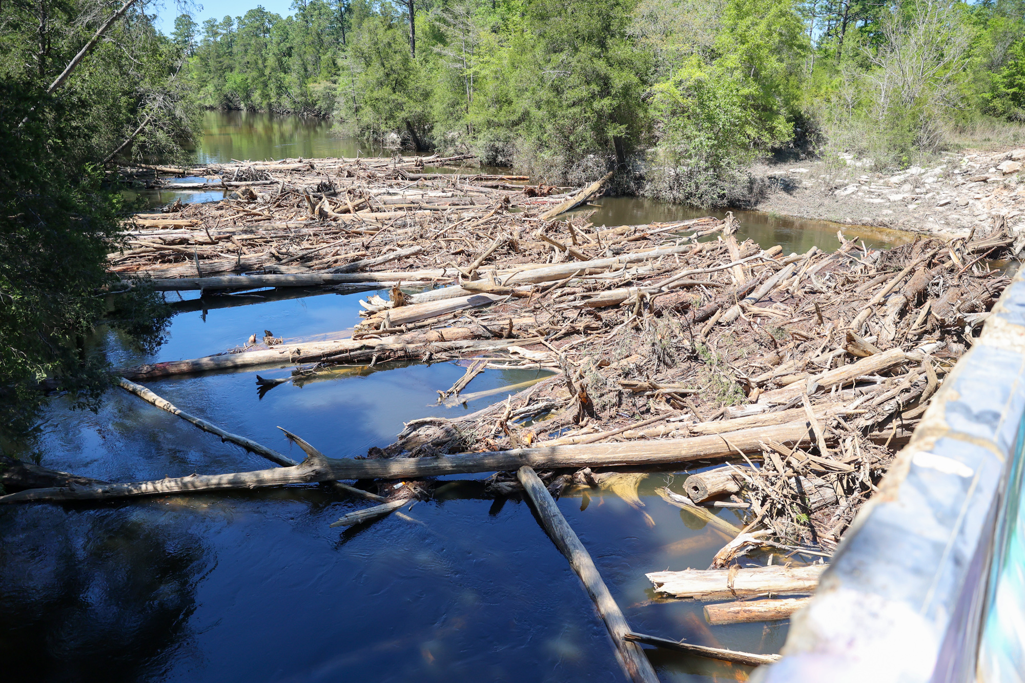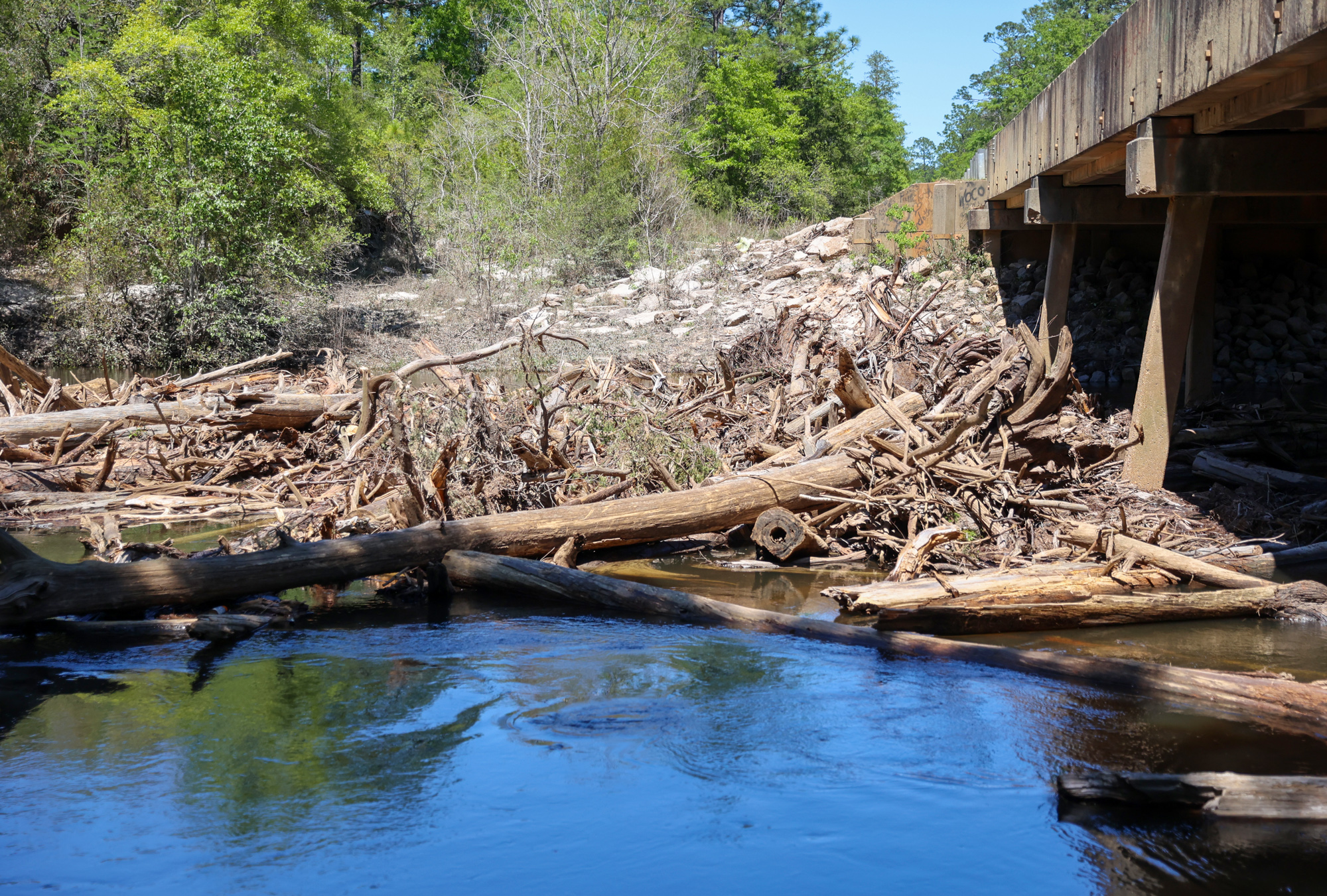 Pictured: The logjam on the Perdido River at the Barrineau Park bridge as seen on Sunday, April 13. NorthEscambia.com photos, click to enlarge.