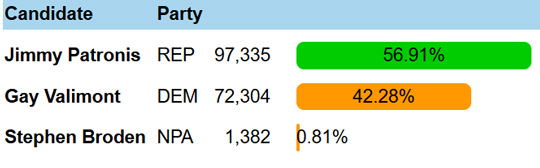 Patronis, who was endorsed by President Donald Trump, received 57% of the vote to 42% for Valimont. Stephen Brody, no-party candidate, received about 1% of the vote.