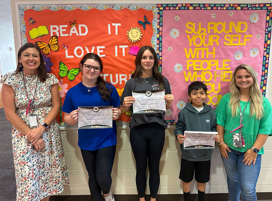 Ernest Ward Middle School recently named their employee and student of the month for May. Pictured (L-R) with Principal Tyvanna Boulanger are students Kaylee Moore, eighth grade; Jocelyn Smith, seventh grade; Hadley Alan Ramos, sixth grade; and Selena Hester, teacher assistant. Photos for NorthEscambia.com, click to enlarge.