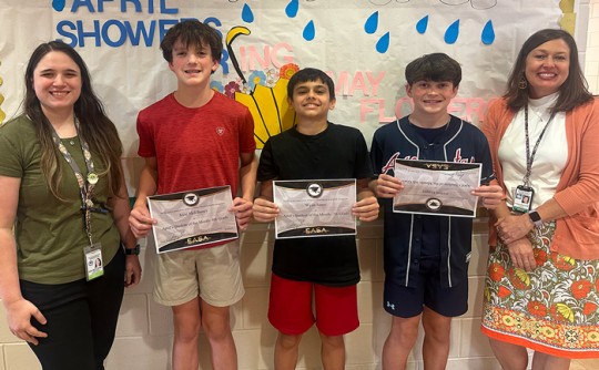 Ernest Ward Middle School recently named their employee and student of the month for April. Pictured with Principal Tyvanna Boulanger (right) are math/inclusion teacher MaryBeth Geary; Jesse McElhaney, eight grade; Wyatt Jones, seventh grade; Colton Hopper, sixth grade. Photos for NorthEscambia.com, click to enlarge.