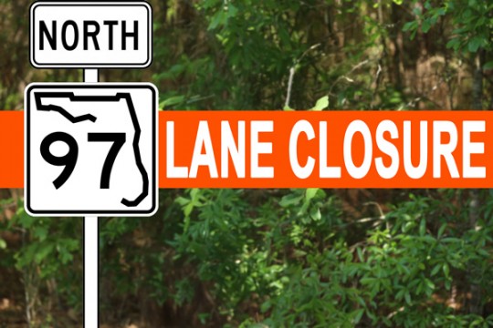 FDOT has announced that northbound lanes of Highway 97 will experience temporary closures between Monday, May 12, and Thursday, May 15 in the area of Pilgrim Trail, about five miles north of the Highway 97 and Highway 29 intersection. The lane closures will take place daily from 8:30 a.m. to 3 p.m.