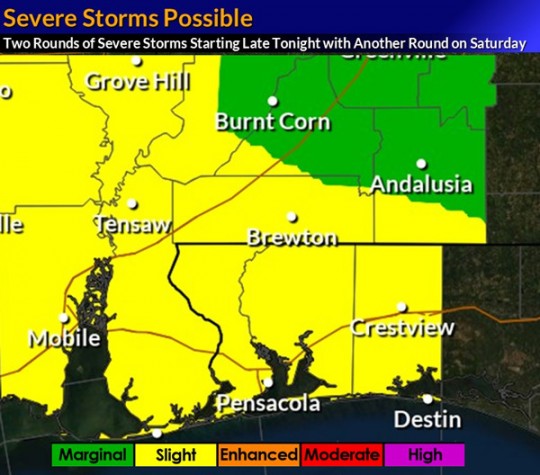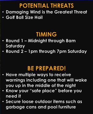 Multiple rounds of strong to severe storms are possible beginning after midnight tonight and lasting through the day on Saturday. The main hazards will be damaging winds and large hail up to golf ball-sized (1.75 inches).