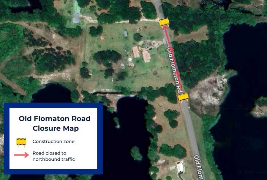 Motorists traveling north on Old Flomaton Road near the construction zone should use extra caution and follow road crew instructions and posted signs when traveling through the work zone. The road is expected to reopen on Wednesday, May 14.