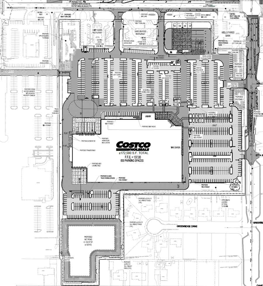The plans show the existing Dairy Queen, Sam’s Seafood Restaurant and Wells Fargo to remain, with a Costco gas station constructed between Sam’s Seafood and Wells Fargo in an area that is currently a parking area for the old shopping center. The current Planet Fitness building will be demolished to make room for the new Costco if it’s approved.