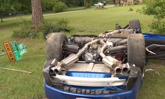 Ouch. Someone couldn’t handle all the power in that car. Can’t quite tell what the remains are (Vette maybe?), but the dual exhaust (not split) from the headers and the racing slicks on the back indicates they probably should have taken it to the drag strip instead of a section of road that couldn’t deal with that force.