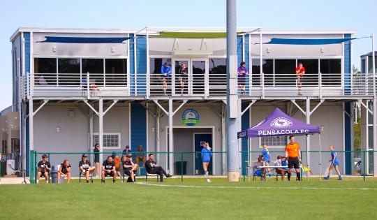 Pictured top: The new site design concept for a new Carver Park Community Center in Cantonment (click to enlarge). Pictured inset: The 2015 ribbon cutting of the current Carver Park Resource Center. Pictured below: U.S. Representative Matt Gaetz meets with local citizens inside the current cramped resource center in 2018. Pictured bottom: A similar building at Ashton-Brosnaham Park during last year’s SEC Women’s Soccer Tournament. NorthEscambia.com photos, click to enlarge.