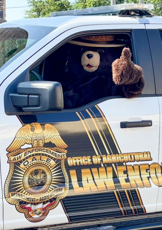 Smokey Bear is about fire prevention, not cheering on arrests. Total misuse of the costume per policies. Easy to find the policies online.