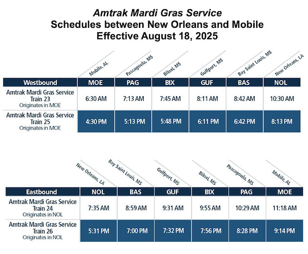 “We encourage customers to get their tickets now to experience this new, comfortable, and scenic service, and have the first opportunity to travel by train on the Mississippi Gulf Coast in nearly 20 years,” said Amtrak President Roger Harris. “Guests can plan travel for football trips this fall, for November and December holiday travel – and even Mardi Gras Season next year.”