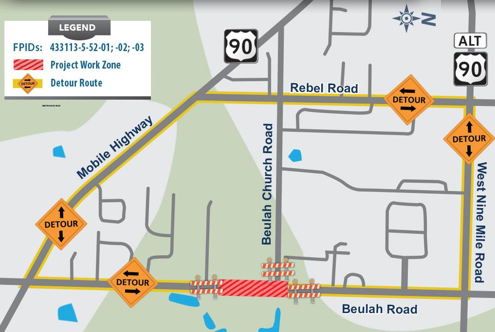The closure is required for crews to construct drainage improvements. Signage is in place for a detour using Rebel Road, Mobile Highway, and Nine Mile Road.