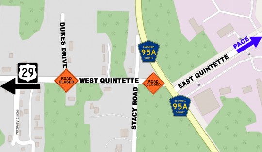 About 950 feet of West Quintette Road is scheduled to be closed on Friday, according to Escambia County.