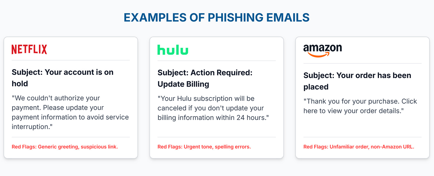 The fraudulent emails often mimic the branding of popular subscription services and will use scare tactics, such as claiming your account has been locked or payment has failed. The goal: get you to click a malicious link or share your financial information.