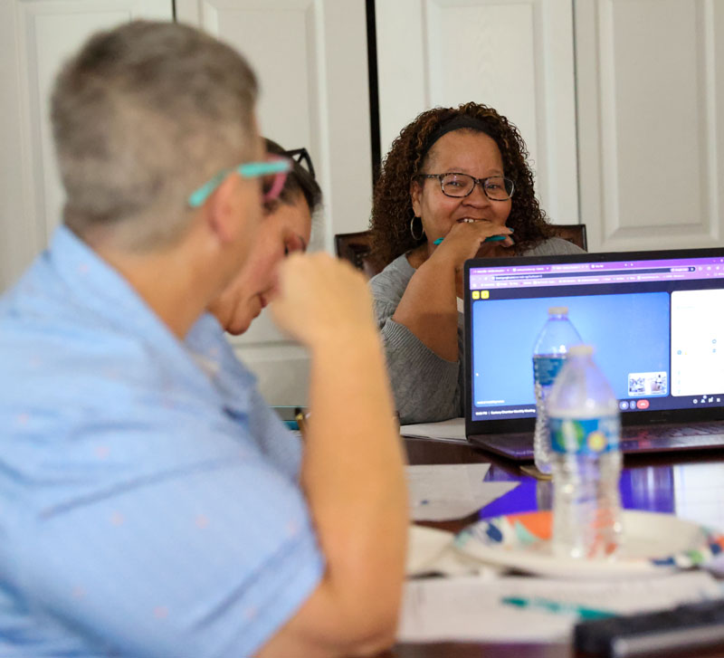 Pictured top: Century council member John Bass discusses his ideas for a “Centurion” honors program during a recent Century Chamber of Commerce meeting. Pictured below: Chamber President Shelisa Abraham (behind computer), who is also a council member, discusses the program with council member Sparkie Harrison (foreground). NorthEscambia.com photos, click to enlarge.