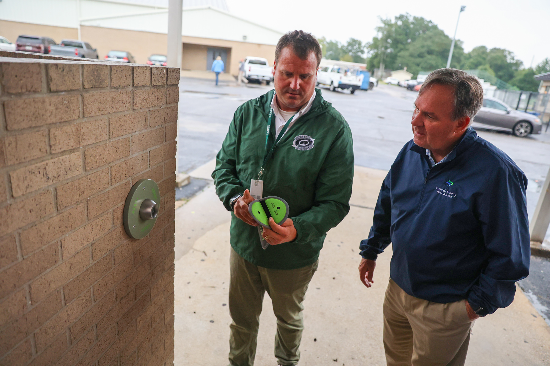 Pictured below: We were there when Escambia County (FL) Public Schools Superintendent Keith Leonard visited Flomaton High School last year to learn about Yondr pouches for locking away cell phones during the school day. Escambia County, Florida, ultimately determined the pouches were too expensive. NorthEscambia.com photos, click to enlarge.