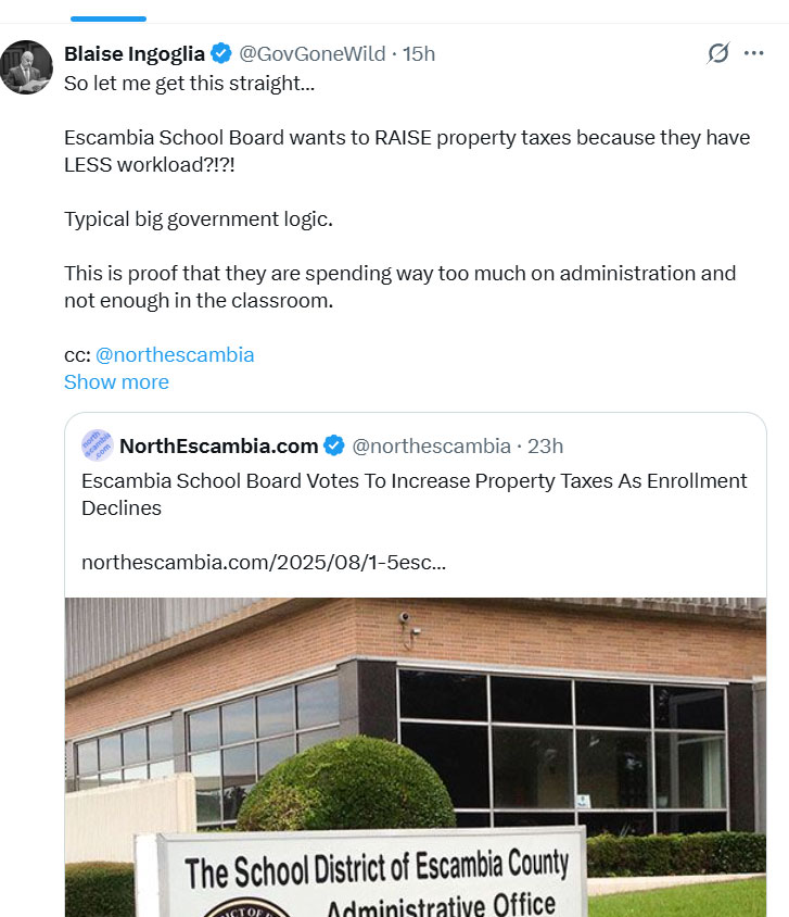 “So let me get this straight… Escambia School Board wants to RAISE property taxes because they have LESS workload,” Florida Chief Financial Officer Blaise Ingoglia wrote on X while sharing the NorthEscambia.com story and tagging Gov. Ron DeSantis. “Typical big government logic. This is proof that they are spending way too much on administration and not enough in the classroom.”