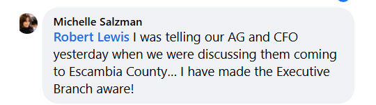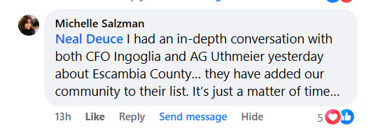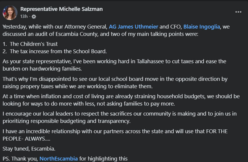 In a post on Salzman’s official Facebook page on Sunday, Salzman said she discussed an audit of Escambia County with Florida Attorney General James Uthmeier and CFO Ingoglia on Saturday. She said the two main talking points centered around the Escambia County Children’s Trust and the Escambia County School Board tax increase.