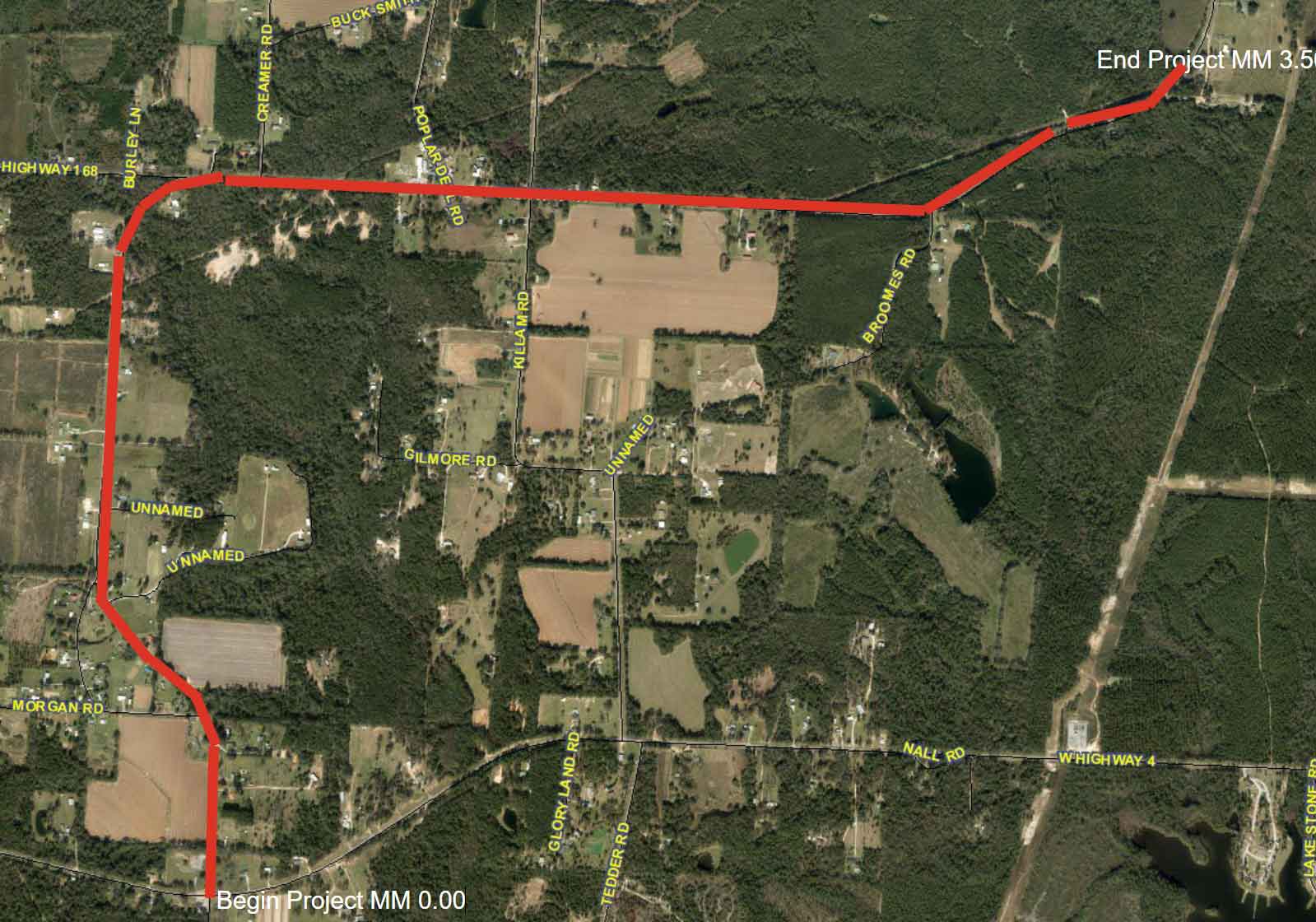 The project limits are from Highway 4, at the traffic light near the Byrneville Community Center, and continuing for 3.5 miles, about a half-mile past Broomes Road.. The entire length of Highway 4A is about 6.7 miles to Highway 29 in Century.