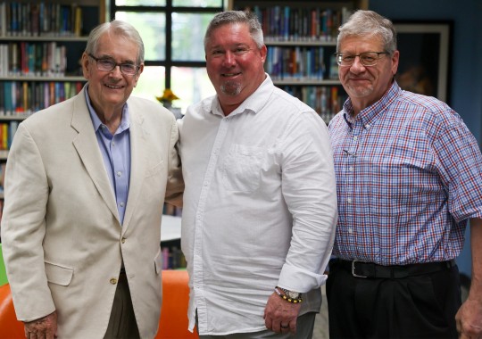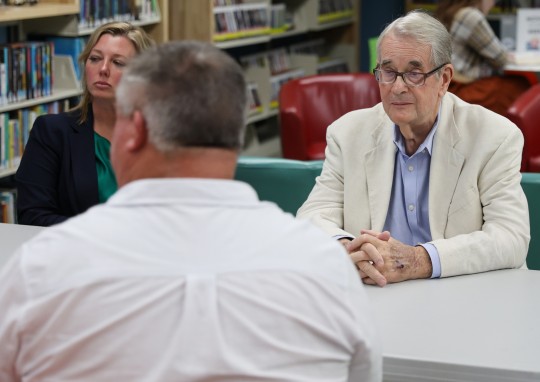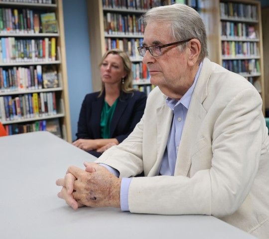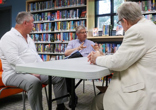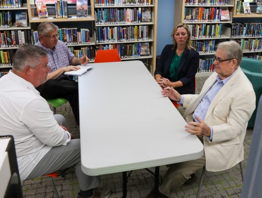 Pictured: Florida Sen. Don Gaetz (in the light-colored jacket) and his legislative aid met Monday afternoon with Century Mayor Ben Boutwell (in the white shirt) and Dave Murzin. The meeting was held at the Century Branch Library as air condition repairs at Century Town Hall continue. NorthEscambia.com photos, click to enlarge.