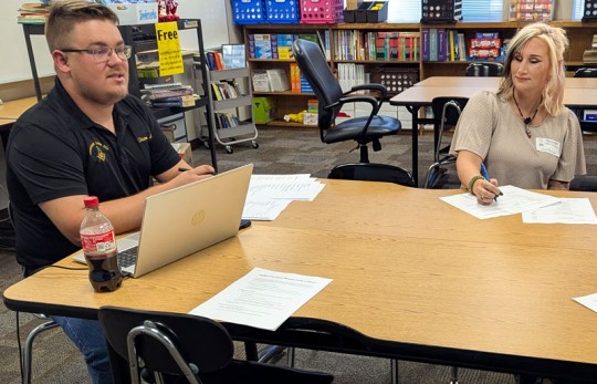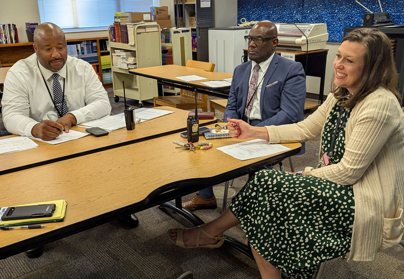 Pictured top: Ernest Ward Middle School PTE President Triston Long and Vice President Tabitha Schoonover at Monday’s meeting. Other board members attended by video. Pictured below (L-R): EWMS Assistant Principal Rodney Drish, Escambia County Public Schools Director of Middle School Education Dr. Michael Roberts, and EWMS Principal Tyvanna Boulanger. NorthEscambia.com photos, click to enlarge.